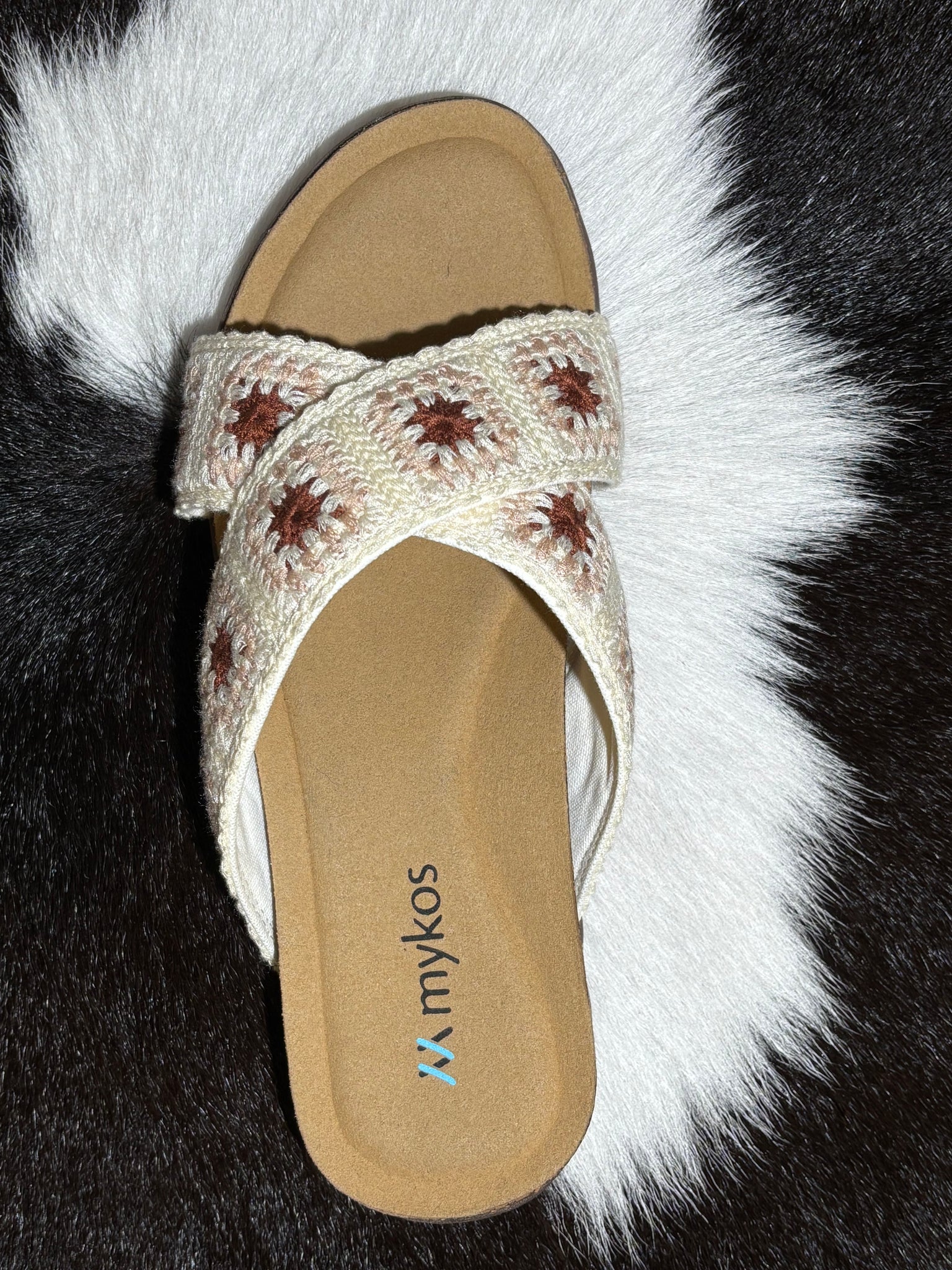 Sandals with a soft comfortable base that has built in arch support with a crocheted pattern of the straps, perfect for any dress occasion!